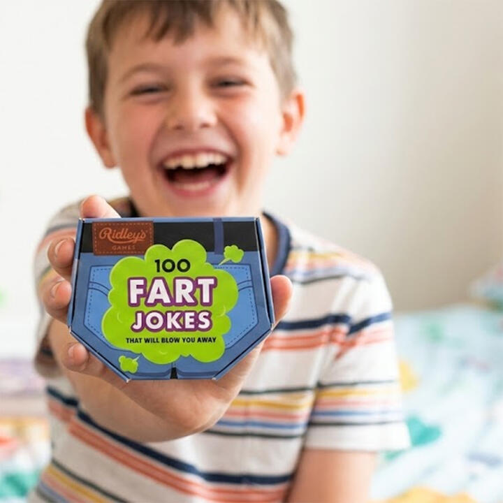 100 Fart Jokes. Ridleys. 100 Fart Jokes from Ridleys Games delivers cheeky puns and silly punchlines that kids and adults will happily repeat. The jokes come stored in a hilarious butt shaped box that makes the theme clear from the moment you see it. Inside are 100 joke cards ready to read out loud and share. It suits ages 8 and up and works for one or more players, which makes it ideal for family nights, parties, and road trips.