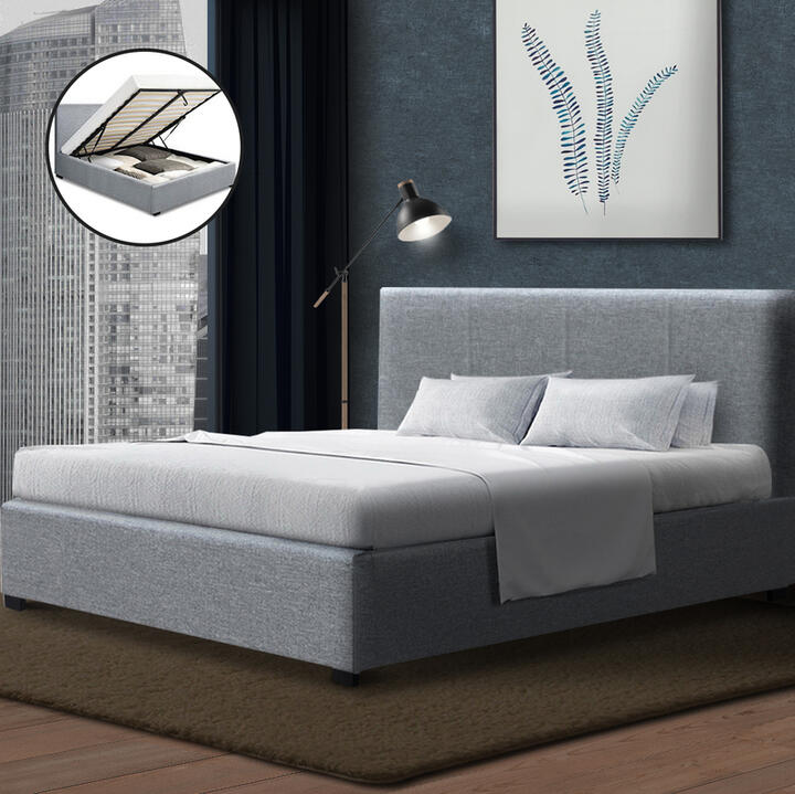 It is time to get the sleep you deserve with this Artiss Nino Bed Frame. Beautifully draped in faux-linen fabric, this is the luxurious bed frame you all deserve to rest in every night. The smooth headboard brings the prestige, whilst the strong steel frame with reinforced steel bars and a wooden arched slat base can put your mind at ease as you know you are sleeping on quality. One of the best qualities is the fact the bed frame has a gas lift which creates an instant storage area with ample space for you to hide away your items. This bed frame has the smarts as well as being great to look at! *Note: Mattress is sold separately. Features Upholstered with premium faux linen fabric Padded with foam Storage function Gas lift hinged base Sturdy legs Easy assembly- 2 people is best *Note: The colours may vary slightly from the image. Fabric base is not included in the bottom of frame. Specifications: Material: 100% Polyester, foam, steel and wood Slats: Wood Fits standard Double-sized mattress: 190cm x 137cm Overall dimensions: 202cm x 1445cm x 87.5cm Colour: Grey Assembly required: Yes Please note: This item comes in 2 packages. Package Content 1 x Bed Frame 1 x Assembly Manual