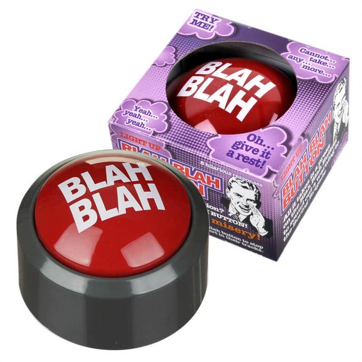 Blah Blah Blah Button. Funtime Gifts. The Blah Blah Blah Button is just what you need to wrap up a conversation and get back to business! With 8 different variations of the phrase "Blah Blah Blah", you'll send a clear message that you've had enough jibber jabber for one day! Has dad gone into lecture mode again? Press the button as a warning that your eyes are glazing over. It lights up red when pressed! It's the perfect gag gift for any colleague or friend who's prone to a good yarn!