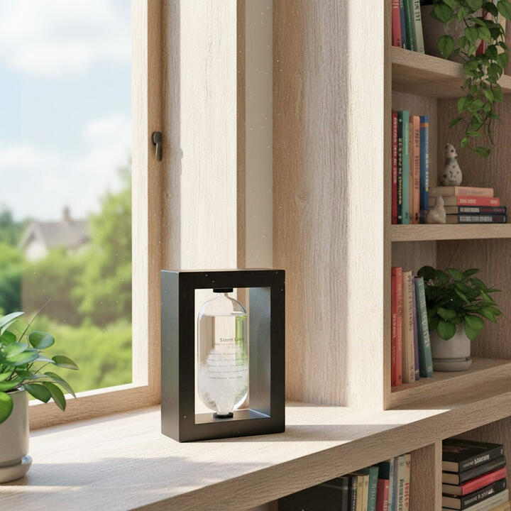 Capsule Weather Station. ISGIFT. The Capsule Weather Station is a stylish way to forecast the weather at home. This capsule-shaped storm glass reacts to air pressure and temperature changes, forming crystals that reveal upcoming weather patterns. Watch as the crystals shift to predict sunshine, storms, or frost, turning weather tracking into a daily visual treat. The wooden frame gives it a natural finish, and the key on the front explains what each crystal pattern means.