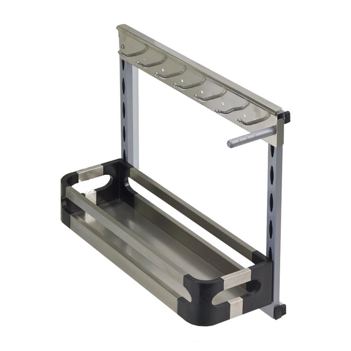 This ELITE Chef Kitchen Pull-Out Cupboard Organiser comes with a basket and hooks to provide a simple and necessary storage solution for a modern kitchen. Most people install this under or close to their sink wash area and use it to hang their washcloths and tea towels out of sight to dry, as well as scrubbing brushes and other high-use utensils. The base basket is great to store your detergents, cleaning products and dishwasher tablets underneath your sink. Soft Close Side Mount Kitchen Organiser Whether you are installing in a new kitchen or updating your old kitchen, this easy-to-mount Kitchen Pull-Out Cupboard Organiser is a necessary and compact storage solution. It has seven (7) hooks where you can hang all types of kitchen items on. Unlike older generation pull-outs with chrome wire baskets where small items fall over, this stainless steel basket keeps your items sturdy and stable. You can store bottles and other types of containers of various heights as the rack is height adjustable. Most people install this under or close to their sink wash area and use it to hang their washcloths and tea towels out of sight to dry, as well as hang scrubbing brushes and other high-use utensils. It can be tucked into your cupboard when not in use, giving you a neater kitchen without sacrificing storage space. With a simple pull-out, your kitchen items are all accessible—no need to reach over to the back of the cupboard. This unit is side-mounted and slides out on high-quality ball-bearing runners. It can be fitted in a 250mm wide cupboard or on the side of a larger cupboard—ideal for all your cleaning products under the sink. Compact Underbench Storage with Hooks TOUGH – Constructed in 304-grade polished stainless steel COMPACT – Conveniently mounts on the side to maximise storage space; comes with 7 hooks and a sturdy basket SOFT CLOSE MECHANISM – Easily slides out on high-quality ball bearing runners, and neatly tucks out of view when not in use FLEXIBLE STORAGE – Adjustable rack height lets you put containers of various sizes without falling over QUALITY – Premium materials and built that comes with a 5-year warranty Specifications Depth: 472mm Width: 145mm (basket width), 195mm (from cabinet wall) Height: 427mm Composition: Stainless steel Cupboard Width: Suits standard 250mm wide (external) cupboard Installation: Can be mounted on right- or left-hand side Warranty: 5 years