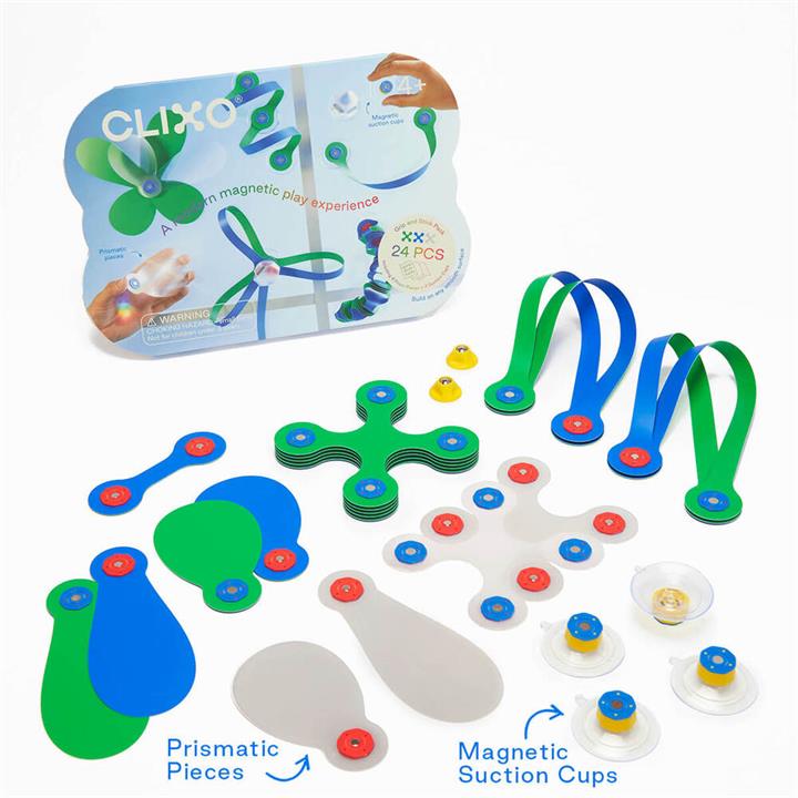Clixo Grip and Stick Pack 24pcs. Clixo. Introducing the Clixo Grip and Stick Pack 24pcs a super fun way to expand and enjoy your kids' creativity! Jam-packed with 24 flexible pieces that reflect the light in all sorts of beautiful colours, watch as your custom creations stick to your window! The translucent holographic parts will throw out a dazzling rainbow, while the strong magnets click, snap and hold the pieces together!