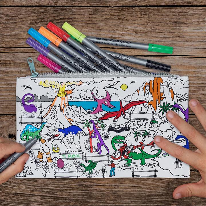 Colour and Learn Dinosaur Pencil Case. Eat Sleep Doodle. Does your little one eat, sleep and breathe dinosaurs? They'll have hours of Jurassic fun with this fabulously fun Colour and Learn Dinosaur Pencil Case! Let them colour in, doodle and name the different dinosaurs on their very own Triassic-inspired pencil pouch. Coming with 10 colourful wash-out fabric pens, they'll be colouring between the lines of the dangerous Dinosaur World in no time!