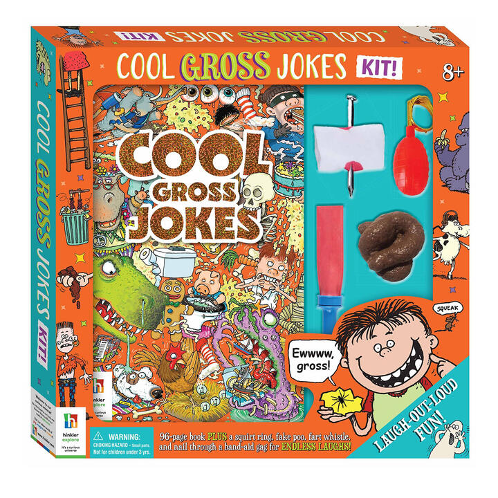 Cool Gross Jokes Kit. Hinkler. The Cool Gross Jokes Kit is bursting with pranks and puns that kids will find hilariously disgusting. From fake poo to a fart whistle, this kit has all the right tools for a good laugh. It comes with a 96-page joke book full of gross humour, plus classic gags like a squirt ring, fake tongue, and nail-through-a-bandage trick. Perfect for prank-loving kids aged 8 and up, its a fun way to keep the laughs coming at home, parties, or anywhere mischief is welcome!