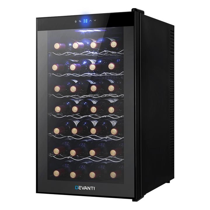 Need a good and reliable wine cooler? Look no further than our Devanti Wine Cooler. Utilising the latest high precision thermoelectric cooling technology, our wine cooler ensures your favourite vintages are kept at their prescribed temperatures with its circulated cool air. The touch control panel makes for easy temperature adjustments and the built-in interior LEDs help you to see your wines in the best light. The stylish and compact design stores up to 28 bottles of wine in a neat and tidy shelving system. Better still, the double-glazed glass door is UV-resistant and provides excellent insulation along with the 30mm thick foam wall. The ensemble works quietly and efficiently and has a handy child-lock on its control panel for total peace of mind. Don?? trust just any product with your precious vintages, trust Devanti. Features: High precision thermo-electric cooling technology Adjustable temperature control Circulating cooling fan system Store up to 28 bottles of wine Pull-out chrome racks UV-resistance glass door Touch control panel Built-in LED light Silent operation Safety child lock Stylish and compact design Energy efficient Eco-friendly Specifications Brand: Devanti Voltage: 220V-240V ~50/60Hz Rated power: 65W Capacity: 28 bottles Volume: 70L Temperature range: 12-18degree centigrade Cooling type: Thermoelectric Noise level: 28dB-32dB Color: Black Dimension: 43cm x 52cm x 74.5cm Assembly required: No Number of packages: 1 Package Contents: 1 x Devanti Wine Cooler 1 x User Manual