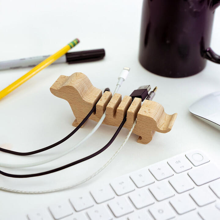 Doggy Wooden Cable Organiser. Kikkerland. Keep your cables in check with the Doggy Wooden Cable Organiser. This loyal pup holds up to five charging cords, keeping them neatly in place and always ready to use. No more tangled cords or runaway cables – this sturdy wooden dog keeps your workspace tidy with a touch of canine charm. Perfect for desks, nightstands, or home offices.