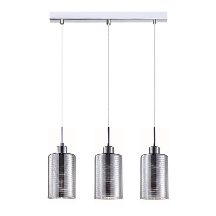 Decorative Glass Pendant Light Bar The Espejo Cylinder Glass Pendant Lights hold 3 suspended lights. The oblong-shaped pendants in this linear model sit along a rectangular metal plate from the ceiling, projecting ambient task lighting over long kitchen benches or dining areas. Each cylindrical shade is finished in luxurious chrome and with transparent streaks that allow light to funnel through. UNIQUE – Cylinder chrome glass shade designed with line streaks for a beautiful lighting effect BROAD LIGHTING – The linear structure is ideal above long kitchen islands or dining tables ADJUSTABLE – Suspended from a cord connected to a ceiling canopy and can be adjusted to your desired length upon installation of a licensed electrician LED-READY – Fitted with E27 lamp bases; choose LED globes to save electricity costs (Not included upon purchase) SAFE – Built with double insulation, hence risk of an electric shock is greatly reduced Specifications Max. Height: 3350mm Depth: 600mm Shade Dimensions: Ø120mm x H180mm Canopy Dimensions: D530mm x H25mm Canopy Shape: Rectangular Suspension: 3000mm PVC cable (Adjustable) Shape: Oblong or cylinder Globes Included?: No Globe Type: ES / ST64 Maximum Wattage: 72W Input Voltage: 220-240V AC Material and Finish (Shade): Glass, Chrome (Smooth) Material and Finish (Lampholder Cover): Iron, Chrome (Electroplated) IP Rating: IP20 (For indoor use only) Recommended Hours of Use: 4-8 hrs / day Double Insulated?: Yes, Class I Inclusions: 1x fitting, 2x screws, 2x raw plugs, 1x installation card, 1x warranty card This product must be installed by a licensed electrician. Installation instructions sheet is provided in the box.