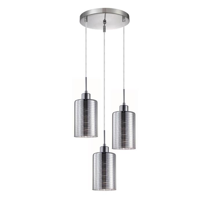 Chrome Glass Drop Lights Cluster The Espejo Cylinder Glass Pendant Lights project ambient task lighting to dining areas, kitchen benches, bedrooms, or any interior space. This cascade model comes with three oblong-shaped pendants hung from a matching round canopy. For added uniqueness, the cylindrical shade is finished in luxurious chrome and with transparent streaks that allow light to funnel through. UNIQUE – Cylinder chrome glass shade designed with line streaks for a beautiful lighting effect CASCADE LIGHTING – Provides wider general illumination and luxurious character to any interior space ADJUSTABLE – Suspended from a cord connected to a ceiling canopy and can be adjusted to your desired length upon installation of a licensed electrician LED-READY – Fitted with E27 lamp bases; choose LED globes to save electricity costs (Not included upon purchase) SAFE – Built with double insulation, hence risk of an electric shock is greatly reduced Specifications Max. Height: 3350mm Depth: 330mm Shade Dimensions: Ø120mm x H180mm Canopy Dimensions: Ø250mm x H25mm Canopy Shape: Round Suspension: 3000mm PVC cable (Adjustable) Shape: Oblong or cylinder Globes Included?: No Globe Type: ES / ST64 Maximum Wattage: 72W Input Voltage: 220-240V AC Material and Finish (Shade): Glass, Chrome (Smooth) Material and Finish (Lampholder Cover): Iron, Chrome (Electroplated) IP Rating: IP20 (For indoor use only) Recommended Hours of Use: 4-8 hrs / day Double Insulated?: Yes, Class I Inclusions: 1x fitting, 2x screws, 2x raw plugs, 1x installation card, 1x warranty card This product must be installed by a licensed electrician. Installation instructions sheet is provided in the box.