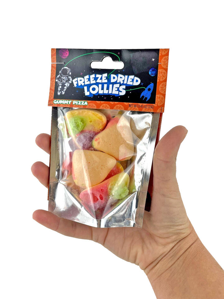 Freeze Dried Candy Gummy Pizza Mini Pack 13g. Freeze Dried Lollies. Introducing our Freeze Dried Candy Gummy Pizza Mini Pack 13g. This isn't just your regular candy, it's a delightful twist on the classic treat, thanks to a freeze-drying process inspired by NASA's Apollo missions. Why are they special? Triple the size for an unmatched crunch. Stays crispy longer with 99% water removal. Bursting with rich Gummy Pizza flavour in every bite!