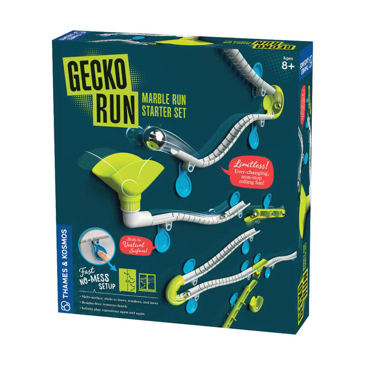 Gecko Run Marble Run Starter Set. Thames & Kosmos. Discover the innovative world of marble runs with the Gecko Run Marble Run Starter Set, where traditional boundaries are redefined. This game-changing set uses flexible tracks and nano pad technology to allow creations to adhere to virtually any smooth surface in your home, from walls to furniture, enabling vertical and horizontal designs without the need for traditional supports. The Gecko Run employs reusable nano pads that stick without leaving marks or residue, meaning you can move and adjust your marble tracks as often as you like. These pads, combined with the durable and flexible tracks made from sustainable materials, ensure endless configurations and fun. Whether its a high-speed downhill race or a complex maze with jumps and turns, the only limit is your imagination.