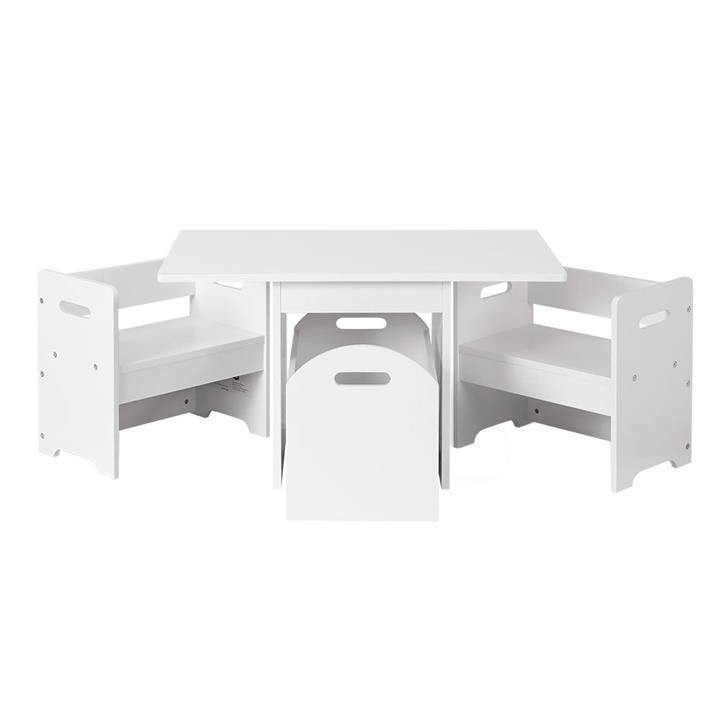 With its modular design, our Kids Table and Chair Set is fun, stylish and a great space saver. Everything is built to form up into each other into one compact unit.The chairs, when pushed right in, sit flushed under the table. Within the centre support, a large storage box with ample space for toys and stuff, can be easily pulled in and out for hidden storage. Further consideration is also given to handling the chairs and box with convenient hand grips on them.Made from eco-friendly MDF board, the entire ensemble is designed to last and be child-safe in every way with non-toxic white paint, round corners and smooth edges. Better still, the chairs and storage box can be use independently anywhere. Giving you more options for their use and practicality.Easy to assemble and clean, our Kids Table and Chair Set is a must for every parent who desires versatility from their kids furniture.Features Durable and practical Eco-friendly and non-toxic paint Kid-safe design Sliding storage box Safe air gap handles Sturdy construction Easy to maintain and clean Easy to assemble Recommended age: 3 years and above EN71 European Safety of Toys certifiedSpecifications Material: MDF board Weight capacity: Table: 40kg, chair: 60kg Table dimension: 75 x 48 x 43cm Seat dimension: 37.5 x 23.5cm Chair dimension: 40 x 24 x 38cm Storage box dimension: 40 x 27 x 33cm Colour: WhitePackage Content 1 x Kids Table 2 x Kids Chair 1 x Storage Box1 x Assembly Manual