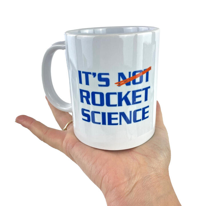 NASA Rocket Science Mug. SimplyCool. The NASA Rocket Science Mug is a clever gift for anyone who loves space, science, or a good laugh. It features the official NASA logo alongside the words "It's not rocket science" – with the "not" cheekily crossed out. Made from durable ceramic, this white mug is great for your morning tea or coffee. The bold blue and red print adds a smart, fun touch to any desk or kitchen.