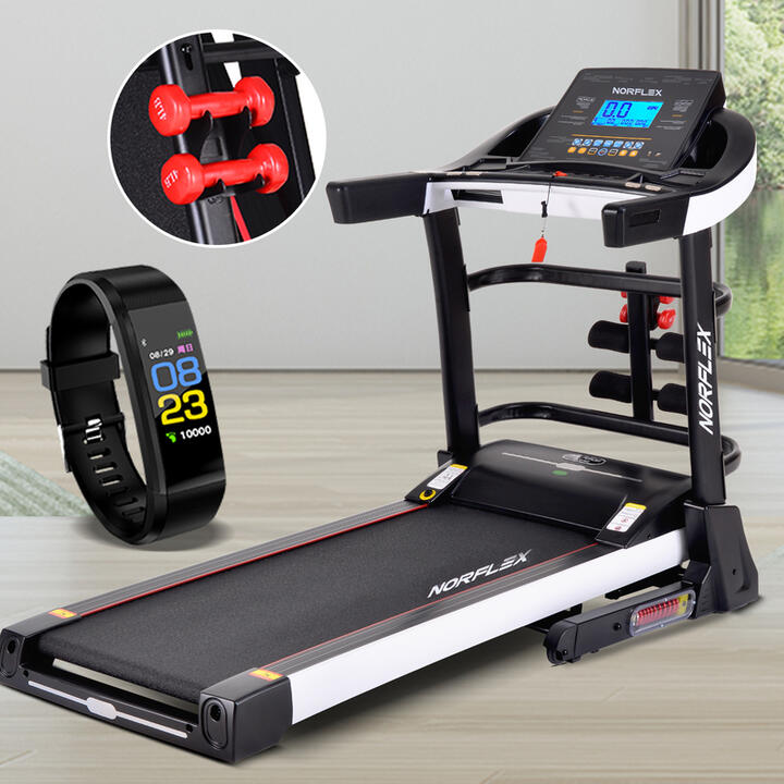 The Norflx XR800VR is an ultra-stable, weight-resistant treadmill that is highly durable and innovative giving you the confidence to run harder and faster than ever before. The modern design of XR800VR allows you to streamline your workout by monitoring time, speed, distance, calories and adjust to a program that best suits your needs. Listen to your favourite podcast or tunes with the iPad holder, MP3 and USB input on high-quality speakers . The treadmill has a 3.5 horsepower motor , 8 levels patented shock absorption system and a generous running platform of 1300mm x 450mm and can handle a user weight of up to 160 kg . The Norflx XR800VR is the perfect treadmill for someone who wants to improve their fitness with the assistance of a high-class, modern, functional product that allows you to take that first step in the right direction. As an added bonus, it also comes complete with a fitness tracker, dumbbells.