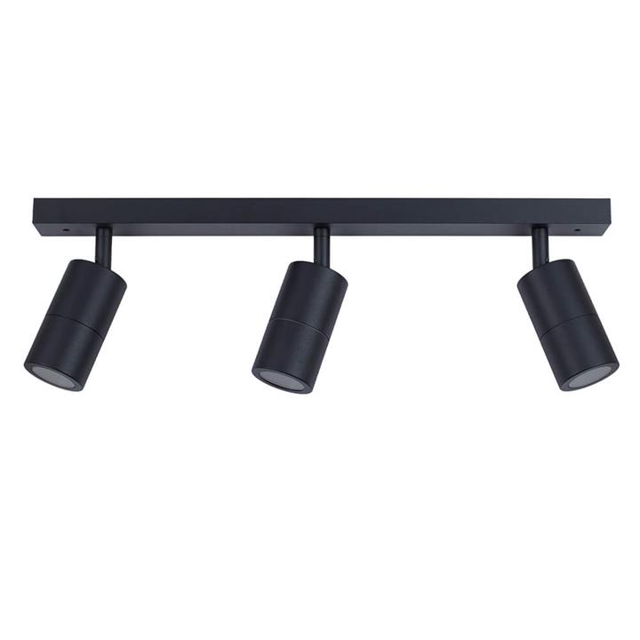 3 Light Overhead Spotlight This Matte Black Triple Spotlight is built with 3 fully adjustable heads that are compatible with LED GU10 globes. It can be installed in ceilings as ambient or accent lighting over your kitchen bar, study areas or patios. Perfect as a light-directing fixture with 90 degree tilt and 270 degree swivel, allowing you to direct lights to beautiful elements at home. Indoor or Outdoor Ceiling Bar Spotlight DIRECTIONAL LIGHTING – Beautiful bar lighting fixture that can illuminate broad areas or add layer lighting in living spaces with its directional heads STYLISH – Built with a matte black finish, providing a sleek and sophisticated feel FULLY ADJUSTABLE – Fitted with three adjustable heads (90° tilt & 270° swivel) with GU10 globe bases LED READY – Use 3 x GU10 globes for an energy saving LED lighting (sold separately) SPLASH PROOF – Tested and approved to IP44, ideal for indoor or outdoor use Specifications Overall Height: 180mm Bar Dimensions: D550mm x H25mm x W50mm Head Dimensions: Ø60mm x H110mm No. of Head/s: Three (3) adjustable heads Swivel: 90° tilt & 270° swivel Input Voltage: 110-265V AC 50/60Hz Globes Included?: No Globe Connection: 3 x GU10 Globe Compatibility: Accepts LED or max. of 35W halogen globes Globe Retainer Type: Push and twist lock Material: Aluminum Finish: Matte black (Powder coated) IP Rating: IP44 (Splash proof) Installation This product must be installed by a licensed electrician. Installation instructions sheet is provided in the product box.