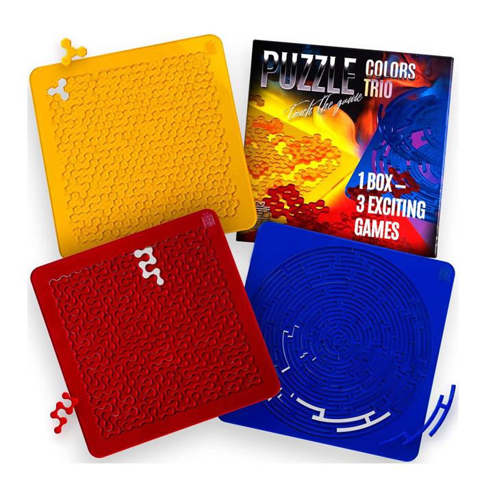 Plexiglass Colours Puzzle Trio. Escape Welt. If you're looking for a change from traditional games, you'll love this extraordinary trio of plexiglass labyrinth puzzles. There's only one distinct way to solve each puzzle, so you'll need to use logic, strategic thinking, and a process of elimination! And, with no visual guide to assist you, these puzzles can be taxing on your brain. Enjoy the process as you arrange the parts to find the perfect solution.