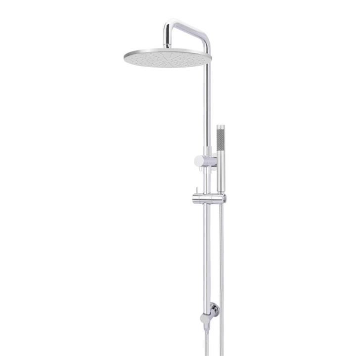 Meir MZ0706-R-C Chrome Combination Shower Rail Set This Meir Round Shower Rail Set is both a functional and decorative addition to any bathroom style. The chrome finish adds a brilliant and modern feel to your bathroom. The 300mm rainfall shower head makes it more efficient while offering a therapeutic and soothing experience. Designed with a single-function handheld shower with compressed nozzles, it gives you the option for a more direct washing. Its universal water inlet enables this shower rail set to be conveniently installed either as a top or bottom water connection. Its built-in diverter lets you seamlessly switch your water flow from the overhead shower to the handheld shower wand and vice versa. Practical Shower Set Upgrade ALL-IN-ONE – A shower rail set with shower head, handheld shower wand, and diverter ADAPTABLE – Can be installed either as a top or bottom water connection, suiting both existing and new homes STYLISH – Brilliant chrome finish adds a modern touch to most bathroom interiors PEACE OF MIND – Backed by a 10-year manufacturer warranty for domestic repair or replacement (conditions apply) Specifications Model: Meir MZ0706-R-CMaterial: Solid BrassHeight: 1062mmWidth: 300mm Depth (from shower arm outlet to mounting points): 410mmFinish: Electroplated Polished Chrome Connection: Standard 1/2″ BSP threadWater Inlet: Universal top or bottom water inlet thread (1/2″ female)Hose: Flexible 1.5m hoseBuilt-in diverter: YesWatermark Approved: certified under AS/NZS 3718:2005WELS Rated: 3 Star, 9 litres per minute flow restrictor installed in accordance with AS/NZS 6400WELS Registration: S15465 (V)WELS Registered Model Name: Round Combination ShowerPlease note, this product may have a visible Meir or Watermark logo.
