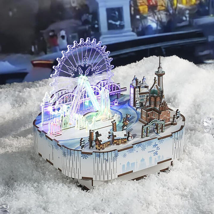 Snow World 3D DIY Rotating Music Box Kit. Tonecheer. Step into a snowy wonderland with the Snow World 3D DIY Rotating Music Box Kit. This beautifully designed kit lets you build a glowing Ferris wheel that gently rotates to the classic melody "Katyusha," creating a mesmerising winter scene. Perfect for music and puzzle lovers, its an ideal gift or unique dcor piece. With 170 pre-cut wooden pieces, this kit offers a fun challenge for ages 15 and up. Assemble iconic landmarks like St. Sophia Church and the Dragon Tower, bringing an enchanting ice city to life. The Ferris wheel lights up and turns, adding a magical finishing touch.