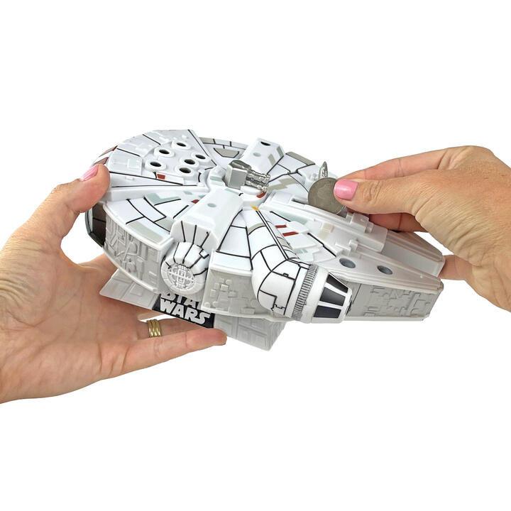 Star Wars Millennium Falcon PVC Bank. Monogram International. The Star Wars Millennium Falcon PVC Bank puts the galaxys most famous ship right on your shelf. This detailed collectible doubles as a handy place to stash your spare change while you plan your next galactic purchase. Measuring approximately 15cm long, this PVC bank captures the iconic shape of the Millennium Falcon in a compact display size. It looks great in a bedroom, office, or alongside the rest of your Star Wars collection.