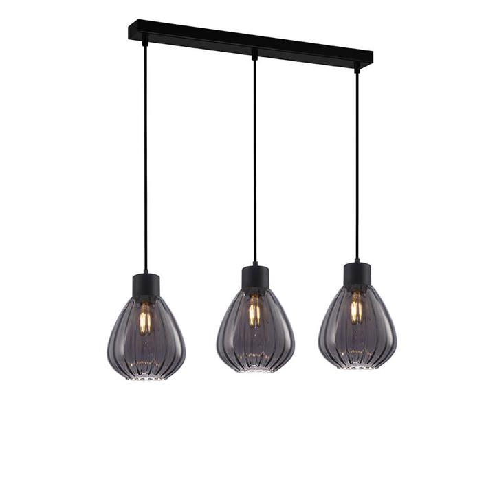 Industrial Style Glass Bar Pendant Lights This Tulip Interior Pendant Lights come with three wine-shaped smoked glass shades suspended from a rectangular metal base. The ribbed glass design plays on light reflection while its open bottom offers direct downwards lighting. Perfect for hanging over long kitchen islands or dining tables. BOLD – Contemporary ribbed glass in smoked finish and matte black holder BROAD LIGHTING – Perfect for any indoor space where you want to create broad, direct illumination; the linear structure is ideal above long kitchen islands, counters, or dining tables ADJUSTABLE – Suspended from a cord connected to a ceiling canopy and can be adjusted to your desired length upon installation of a licensed electrician LED-READY – Fitted with E27 bulb holders which are compatible with energy-saving LED globes (Not included) SAFE – Built with double insulation, hence risk of an electric shock is greatly reduced Specifications Height: D805mm x H3295mm Shade Dimensions: D200mm x H270mm Canopy Dimensions: Ø650mm x H25mm Canopy Shape: Rectangular / Bar Suspension: 3000mm PVC cable (Adjustable) Shape: Wine Globes Included?: No Globe Type: E27 screw Max. Wattage: 72W Input Voltage: 220-240V AC Shade Material and Finish: Glass, Smoked (Smooth) Lampholder Cover Material and Finish: Iron, Matte black (Powder coated) IP Rating: IP20 (For indoor use only) Recommended Hours of Use: 4-8 hrs / day Double Insulated?: Yes, Class I Inclusions: 1x fitting, 2x screws, 2x raw plugs, 1x installation card, 1x warranty card This product must be installed by a licensed electrician. Installation instructions sheet is provided in the product box.