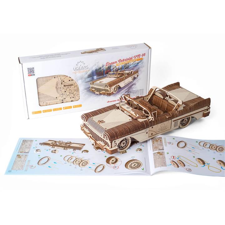 UGears Dream Cabriolet VM05. UGEARS. UGears Dream Cabriolet VM-05 is a premium DIY wooden mechanical model car inspired by classic 1950s engineering. Build a self-propelled cabriolet with a rubber-band motor, moving mechanisms, and interactive details you can see in action. Self-propelled drive: rubber-band motor powers forward and reverse movement Working mechanics: view the V-8 engine, gears and cranks operating under the hood Interactive features: steering wheel control, window cranks, functional windshield wipers Extra details: lifting jack and repair kit mounted in the trunk 739 precision-cut plywood pieces: no glue or special tools required Difficulty: Hard | Build time: ~13 hours Assembled size: 35cm x 15.7cm x 8.9cm Recommended age: 14+ Includes step-by-step, full-colour instructions in 11 languages. Contains button cell batteries: No.