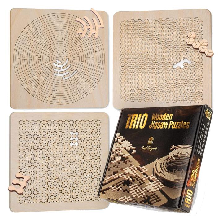 Wooden Puzzle Trio. Escape Welt. Are you ready for a triple does of puzzle fun? Our Wooden Puzzle Trio is an exclusive set of 3 high-quality birch wood puzzles, each with a unique number of pieces. Whether you prefer to play alone or in a group, each puzzle will challenge your logical thinking skills and provide a satisfying tactile experience as your play by hand!